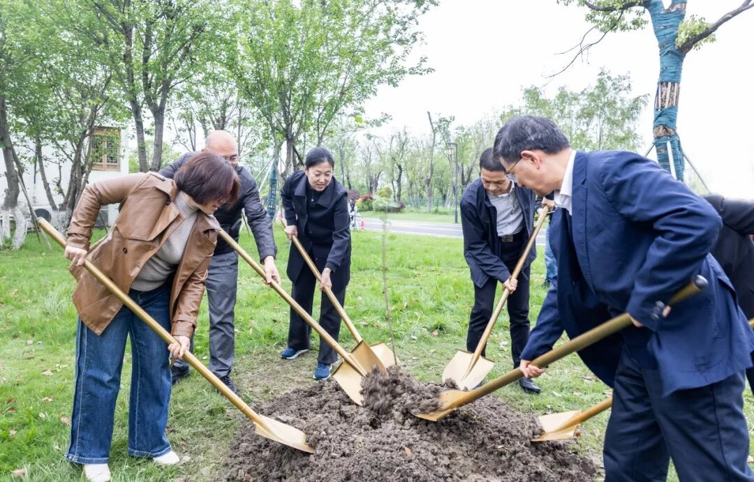 随后,与会人员前往室外,共同为“牛顿苹果树”培土、浇水,完成栽植。